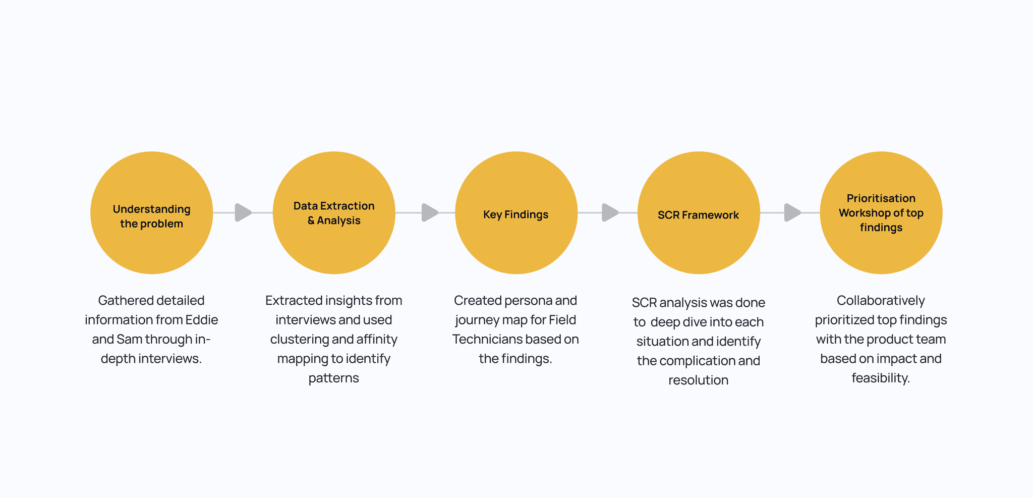 I analysed how the existing processes impacted field performance. My first step was to map where technicians were losing time and clarity.