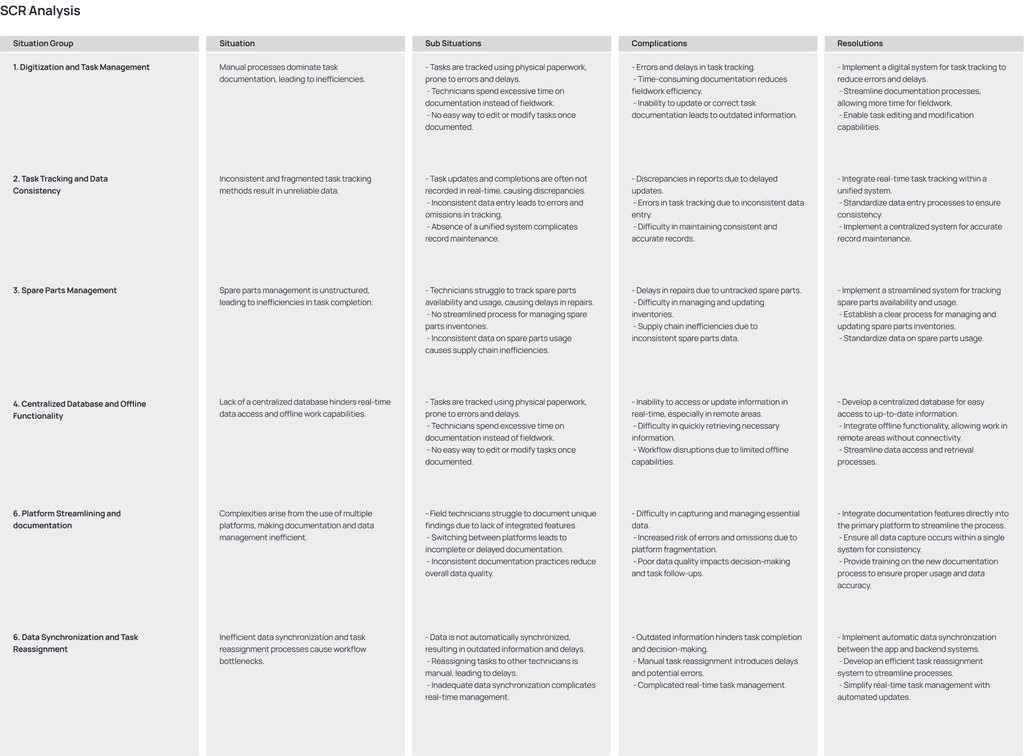 I used the SCR (Situation + Complication + Resolution) framework for a deeper analysis to derive the findings: Situation: Understanding the current context and facts as they stand today. Complication: Identifying the challenges and reasons that require action. Resolution: Defining the next steps or solutions to address the challenges
