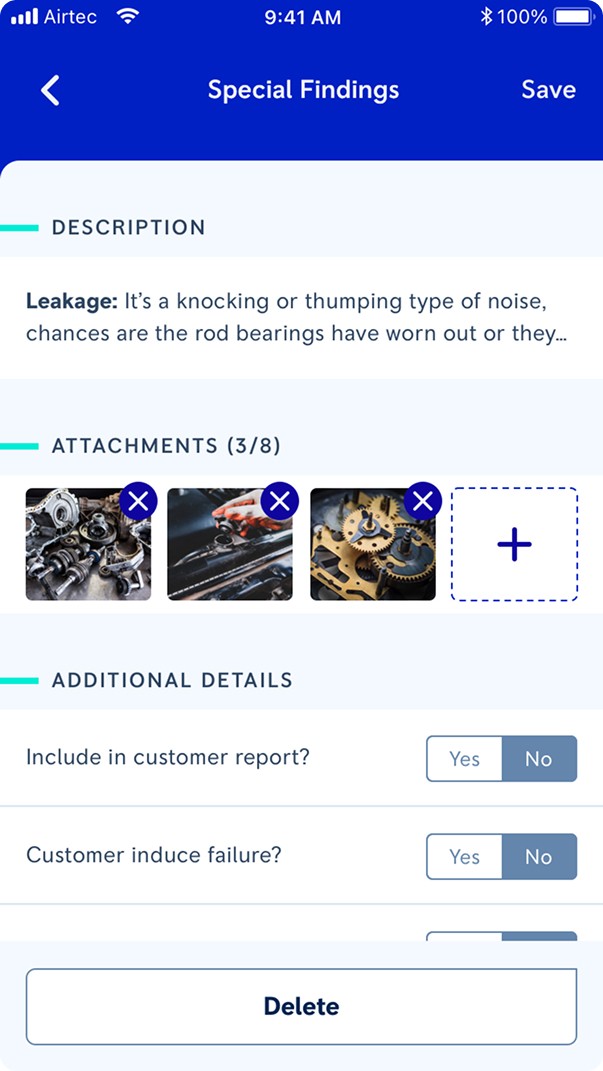 Technicians can record detailed observations directly on-site, including notes, photos, and additional details, eliminating the need for handwritten reports or follow-up clarifications.