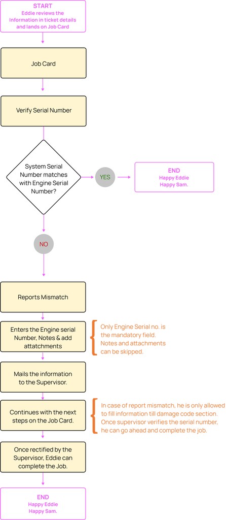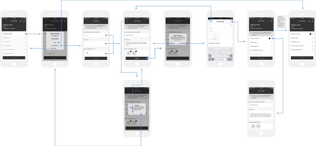Using the prioritized user stories as a foundation, I created detailed user flows for key tasks such as creating a job card, verifying serial numbers, documenting issues, and updating task progress. Each flow focused on reducing steps, preventing repeated data entry, and offering clear status visibility. By mapping the flows end-to-end, I ensured that both technicians and supervisors could complete their tasks without confusion, unnecessary actions, or bottlenecks that existed in the earlier process.