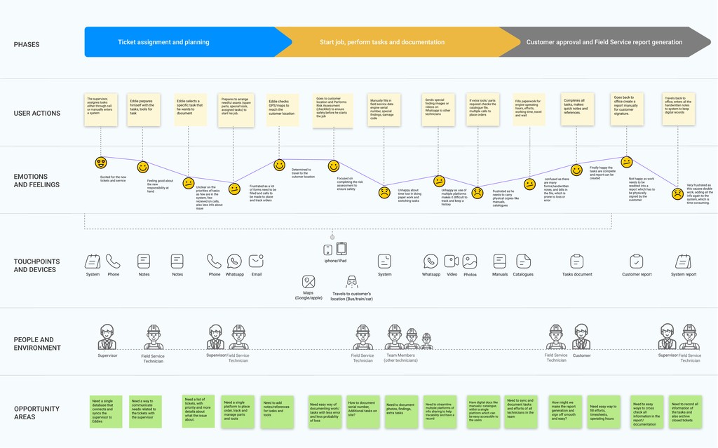 Using the SCR findings, I visualized the entire journey for both technicians and supervisors. This made it clear where time was being lost, where information broke down, and where users felt the most pressure. The journey map became a central artifact that aligned the team around the real priorities