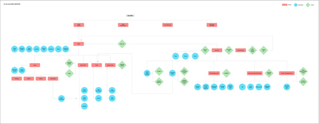 After identifying the core pain points, I moved into structuring the information architecture. My goal was to reduce the cognitive load for technicians and make critical tasks easy to find and complete. I reorganized key modules such as task logging, service history, spare parts, and supervisor communication into a streamlined hierarchy that aligned directly with their real workflow. This helped ensure that the system felt intuitive from the first interaction and minimized the back-and-forth that technicians struggled with earlier