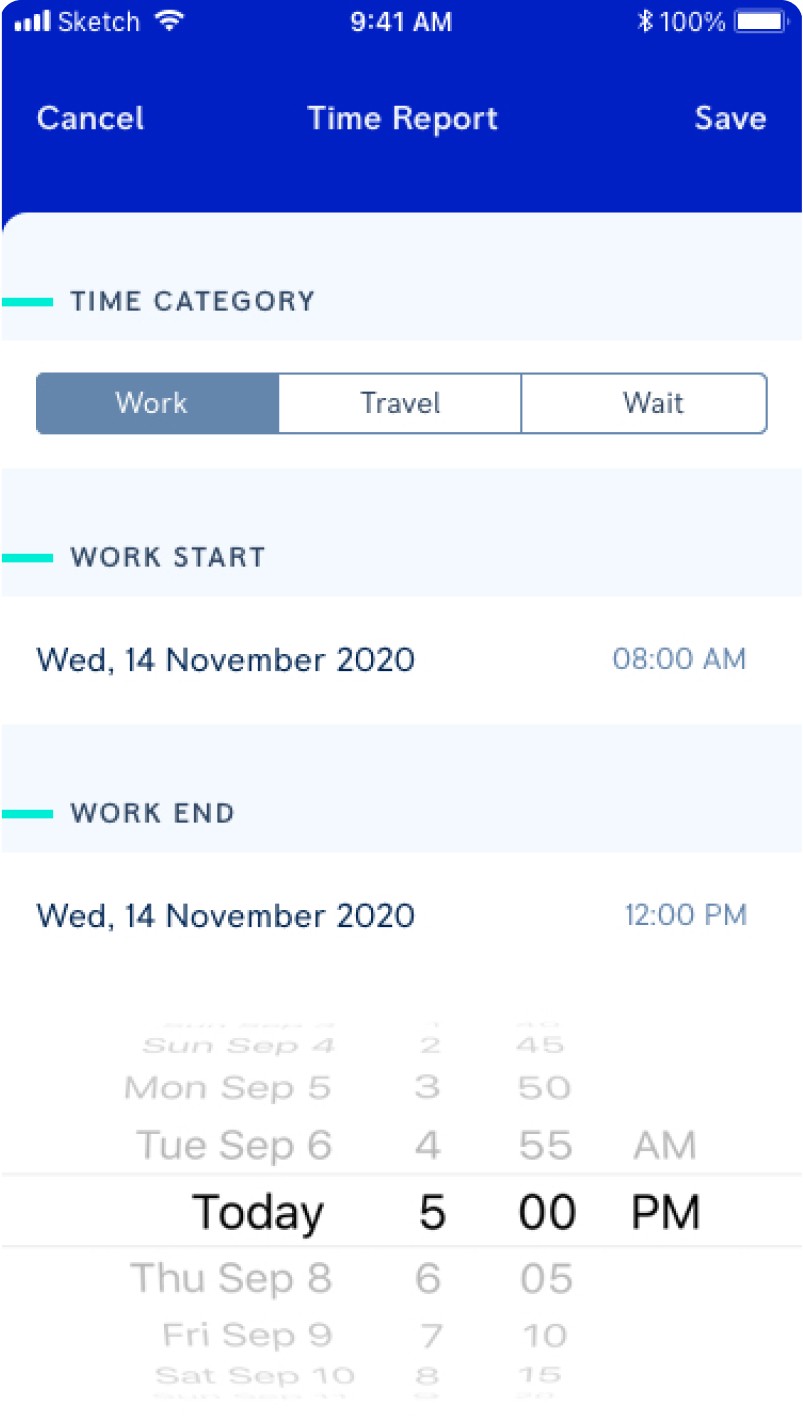 A clean, touch-friendly layout allows technicians to select time categories, adjust start and end times, and submit reports in just a few taps, saving effort during a busy day on-site.