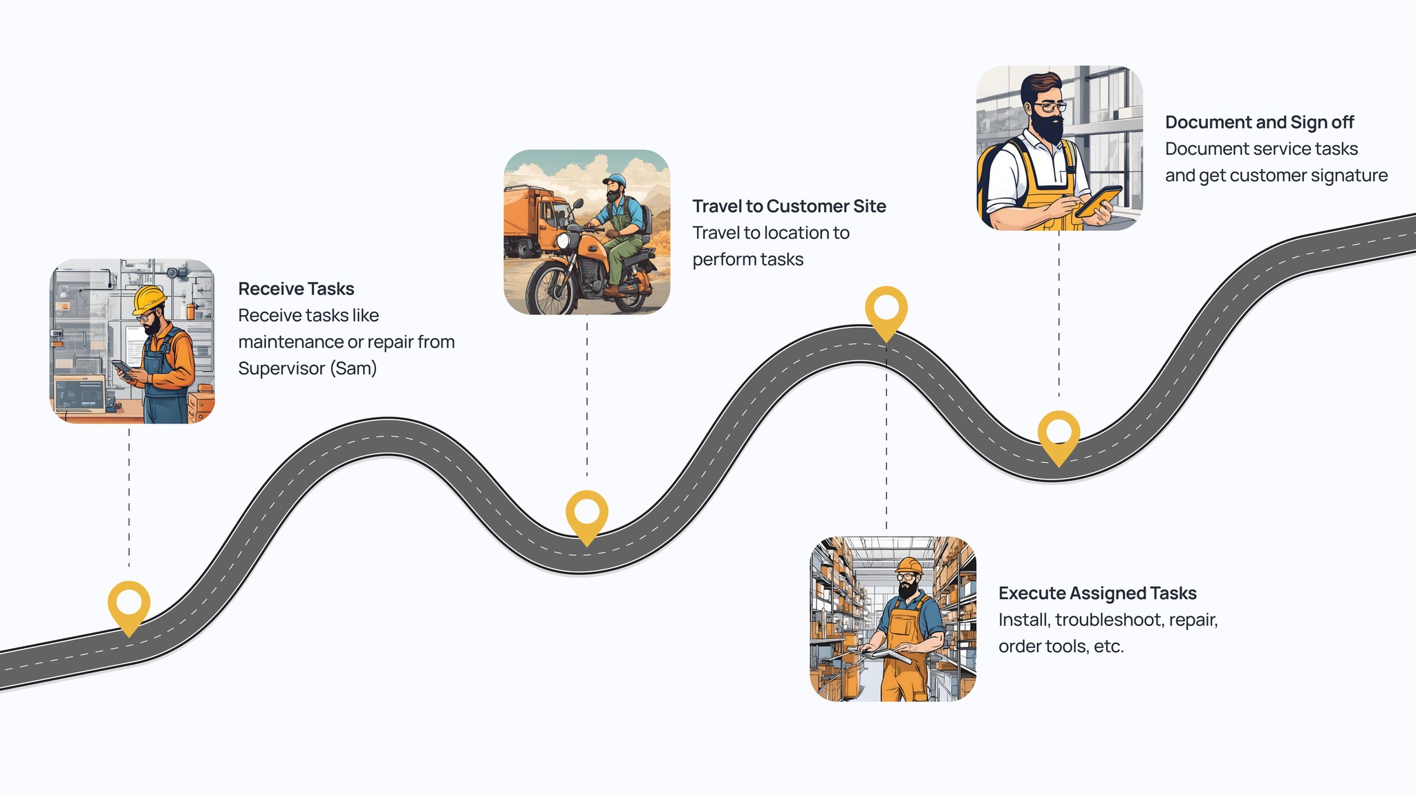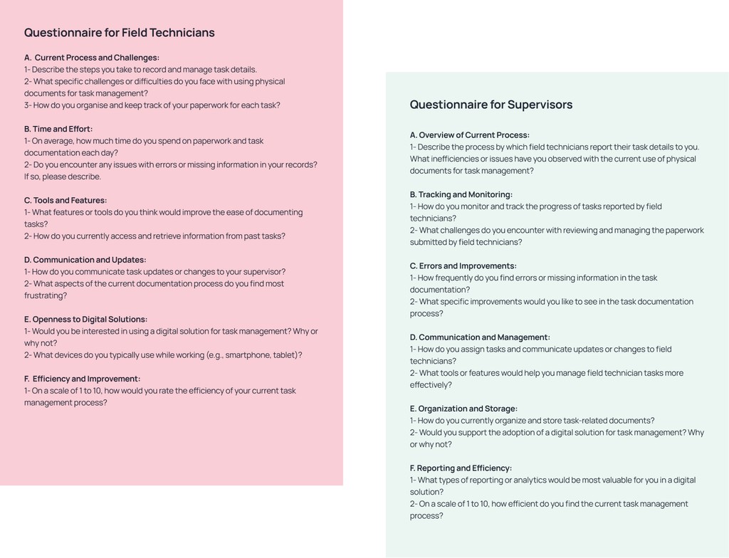I started by interviewing both field technicians and supervisors to understand their real workflow, not just the documented one. These conversations uncovered several recurring themes — reliance on memory, scattered documentation, and constant back-and-forth communication. Hearing their stories helped me map the gaps between how work was supposed to happen and how it actually happened