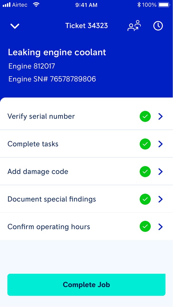 Guided Checklist: Once the job begins, the interface transitions into a simple, step-by-step checklist that mirrors their real workflow, making it easy to complete required actions, document findings accurately, and avoid common errors.